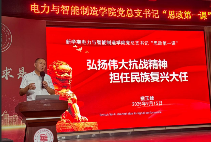 根據(jù)學(xué)校黨委的安排部署,9月15日在圖書館8樓,電力與智能制造學(xué)院黨總支書記褚玉峰教授以“弘揚偉大抗戰(zhàn)精神,擔(dān)任民族復(fù)興大任”為題目,為2025級電力系統(tǒng)自動化技術(shù)、電氣自動化技術(shù)、智能制造技術(shù)等三個專業(yè)的新同學(xué)講授“思政第一課”。