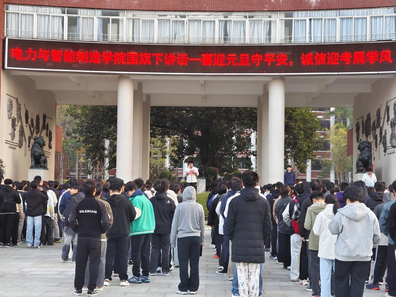 電力與智能制造學(xué)院學(xué)管主任鄭理廣老師在國旗下講話中,回顧了2025年電力學(xué)院師生攜手奮進(jìn)的拼搏歷程,向大家致以新年的美好祝福,號召全體師生以飽滿熱情迎接2026年的新征程。針對元旦假期與校園日常安全,同時重點(diǎn)強(qiáng)調(diào)了交通安全、消防安全與校園安全的核心要求,提醒同學(xué)們遵守交通規(guī)則、規(guī)范用電用火、文明課間活動,始終將“生命至上,安全第一”的理念牢記心間,共同守護(hù)和諧平安的校園環(huán)境。最后,面對即將到來的期末考試,鄭理廣老師提出三點(diǎn)希望:一要科學(xué)制定復(fù)習(xí)計劃,查漏補(bǔ)缺扎實(shí)備考;二要嚴(yán)守考試紀(jì)律,拒絕抄襲作弊,以真實(shí)成績彰顯品德;三要調(diào)整心態(tài)從容應(yīng)考,正確看待考試的檢驗意義。