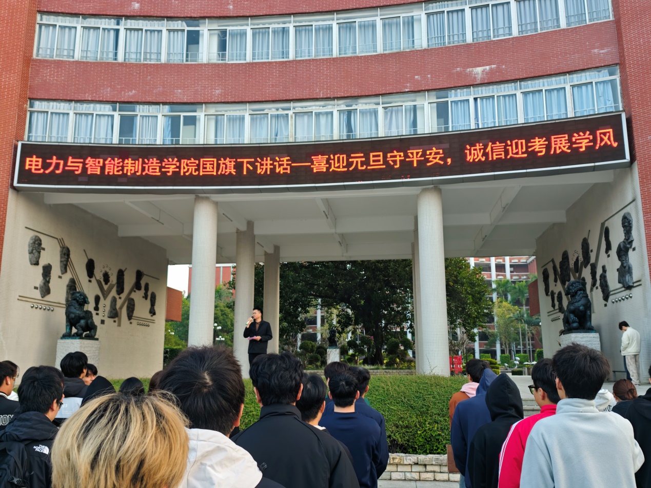 寒風(fēng)送舊歲,暖陽迎新年。2025年12月29日,電力與智能制造學(xué)院舉行“喜迎元旦守平安,誠信迎考展學(xué)風(fēng)”主題升旗儀式。師生們在莊嚴(yán)的國旗下共同辭舊迎新,筑牢安全防線,凝聚誠信應(yīng)考共識。本次升旗儀式由學(xué)院團(tuán)委書記王明偉主持,學(xué)院黨總支專職書記、學(xué)管主任鄭理廣、學(xué)院全體輔導(dǎo)員、學(xué)院2024級、2025級全體同學(xué)們參加了升旗儀式。