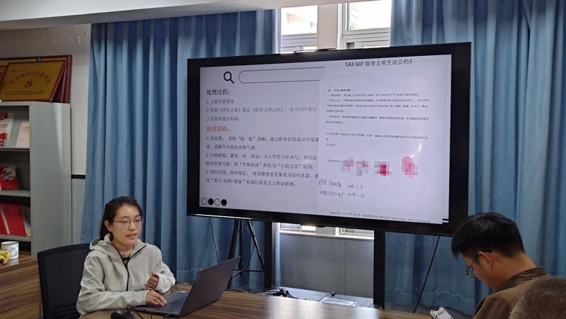 輔導(dǎo)員郭曉倩老師分享了宿舍矛盾處理的經(jīng)驗(yàn),在班級(jí)行政管理中引入高階管理力量,協(xié)助解決復(fù)雜問題,在一線工作中,通過依托規(guī)章制度開展管理,發(fā)揮秩序維護(hù)作用。