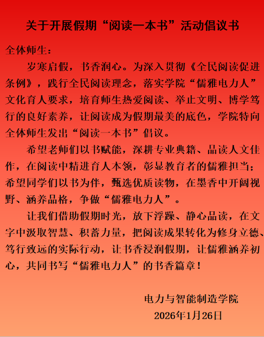 會(huì)議強(qiáng)調(diào),要以此次“假期閱讀一本書(shū)”活動(dòng)為契機(jī),營(yíng)造學(xué)院“人人愛(ài)閱讀、處處飄書(shū)香”的濃厚氛圍,切實(shí)把《全面閱讀促進(jìn)條例》精神轉(zhuǎn)化為推動(dòng)全民閱讀高質(zhì)量發(fā)展的實(shí)際成效,為建設(shè)書(shū)香社會(huì)、文化強(qiáng)國(guó)貢獻(xiàn)力量。