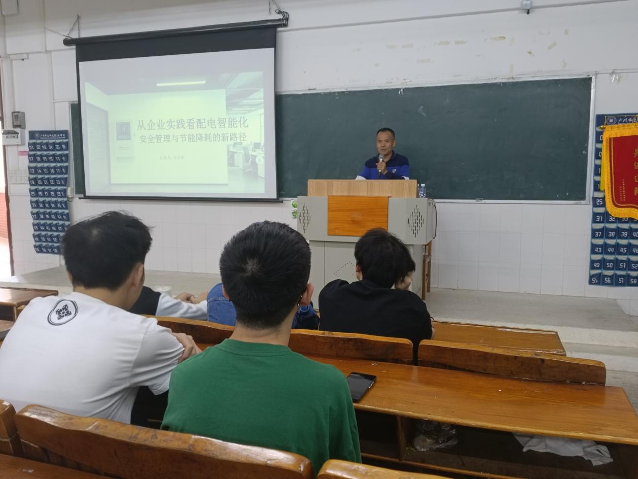 講座現(xiàn)場,吳貴和副董事長圍繞主題,結(jié)合自身數(shù)十年的企業(yè)實(shí)踐經(jīng)驗(yàn)及廣州銀變電力的發(fā)展歷程,從配電智能化的發(fā)展背景、核心技術(shù)應(yīng)用入手,重點(diǎn)講解了企業(yè)在配電安全管理中的實(shí)操要點(diǎn)、常見隱患排查方法,以及節(jié)能降耗領(lǐng)域的創(chuàng)新技術(shù)與實(shí)踐路徑。他摒棄晦澀的理論說教,采用“理論+企業(yè)真實(shí)案例”的方式,結(jié)合廣州銀變電力在配電設(shè)備智能化升級中的實(shí)踐,以及行業(yè)內(nèi)利用“物聯(lián)網(wǎng)+大數(shù)據(jù)”實(shí)現(xiàn)智慧用電、節(jié)能降耗的典型案例,生動剖析了配電智能化系統(tǒng)在安全管控、能效優(yōu)化中的應(yīng)用場景,分享了企業(yè)通過智能化改造實(shí)現(xiàn)安全升級、降低能耗的成功經(jīng)驗(yàn)——如通過智能監(jiān)測終端實(shí)時采集電氣參數(shù)、排查安全隱患,有效提升供電可靠性,同時降低線損與人工運(yùn)維成本,讓在場學(xué)生對配電智能化的實(shí)踐價值有了直觀且深刻的認(rèn)知。
