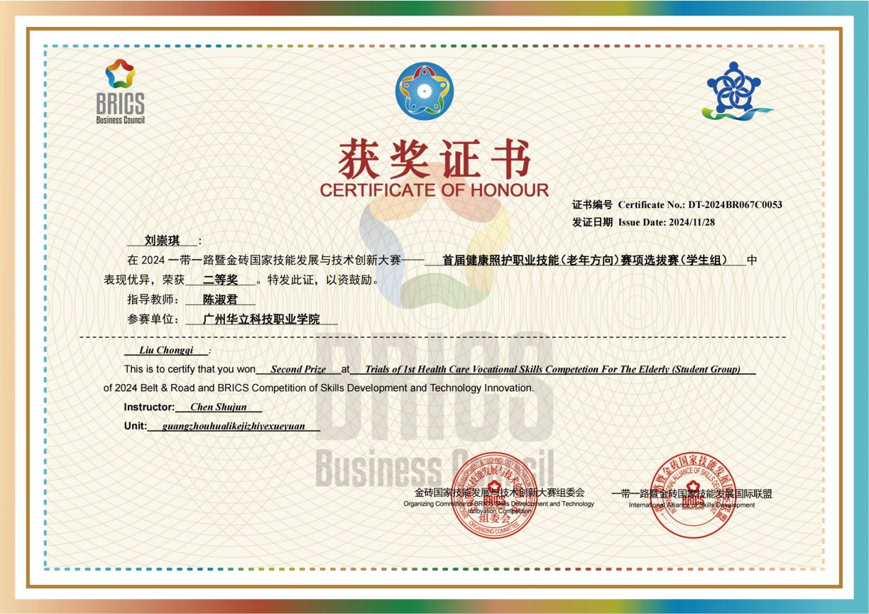 經(jīng)過激烈角逐,我校健康學院陳淑君老師指導的劉崇琪同學榮獲選拔賽二等獎,以選拔賽53名的成績成功晉級決賽,并在正式?jīng)Q賽中獲得優(yōu)秀獎;楊敬博師指導的何嘉欣同學在選拔賽中榮獲優(yōu)秀獎。