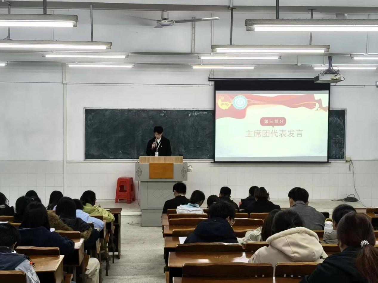 隨后,主席團代表上臺述職。代表全面復盤本學期迎新活動、社團招新、班級大合唱、校運會、學風建設(shè)演講比賽及校外服務(wù)等重點工作成效,同時直面部門協(xié)同質(zhì)效不高、創(chuàng)新實踐活力不足等短板,明確優(yōu)化方向,并寄語全體團學成員深耕實干、篤行致遠,送上前程似錦的誠摯祝福。