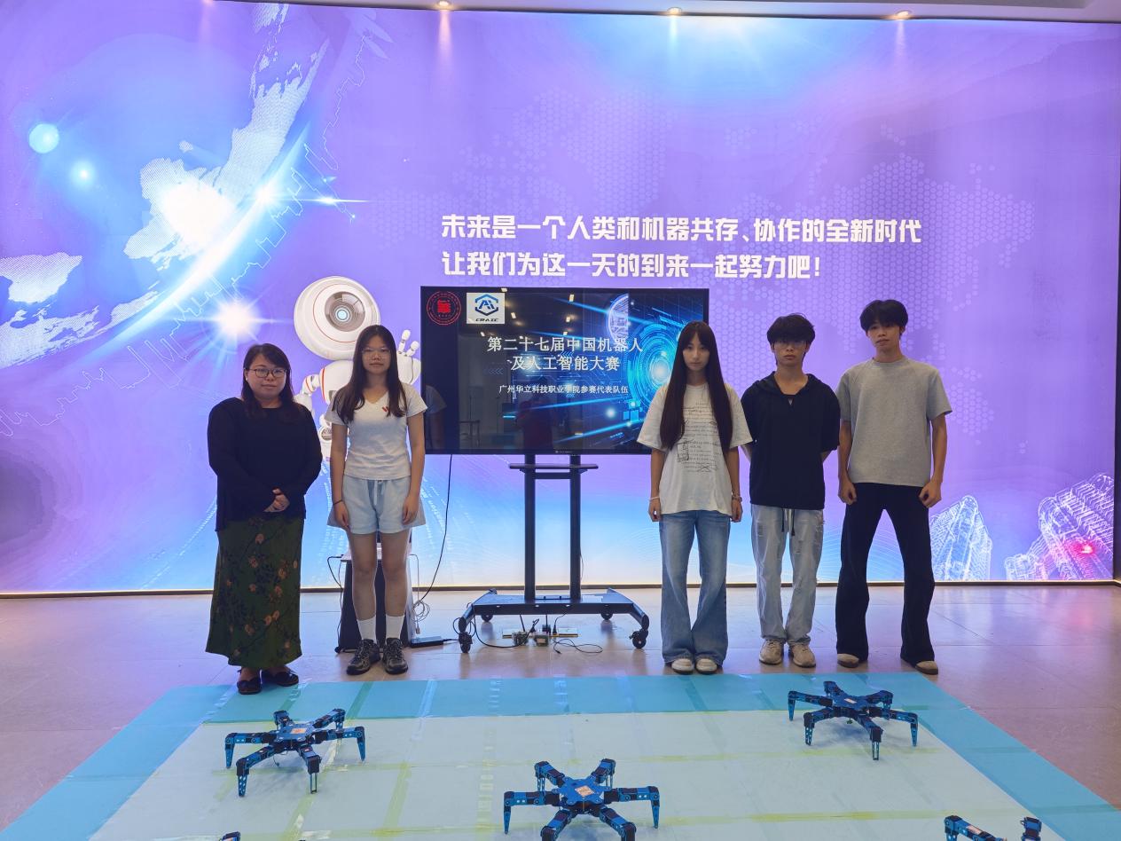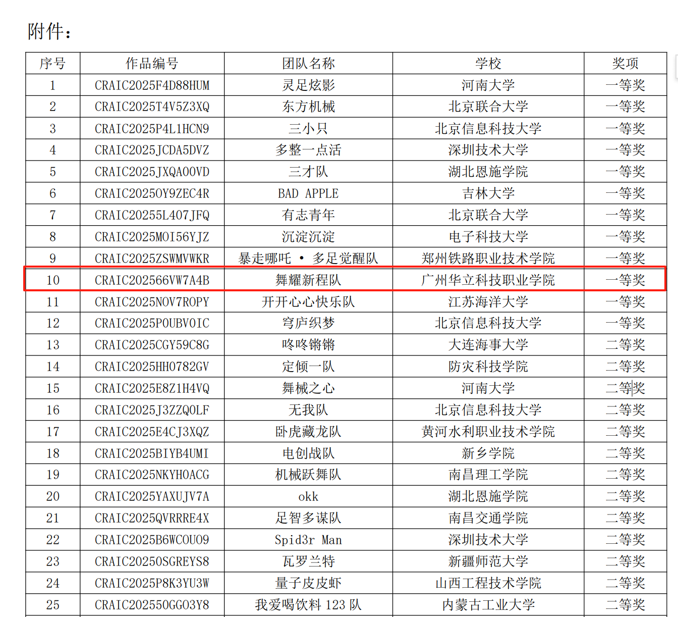 在廣州華立科技職業(yè)學(xué)院計(jì)算機(jī)信息工程學(xué)院王建華院長(zhǎng)、閔小翠副院長(zhǎng)的統(tǒng)籌指導(dǎo)下,學(xué)院精心選拔參賽隊(duì)伍,嚴(yán)格組織備賽工作,持續(xù)優(yōu)化參賽作品。兩支代表隊(duì)——“舞耀新程隊(duì)”和“專(zhuān)業(yè)團(tuán)隊(duì)”分工明確、配合默契。在歷時(shí)兩個(gè)多月的緊張備賽過(guò)程中,隊(duì)員們反復(fù)調(diào)試程序、優(yōu)化機(jī)械結(jié)構(gòu)、精心設(shè)計(jì)機(jī)器人舞蹈動(dòng)作,面對(duì)諸多挑戰(zhàn)團(tuán)結(jié)協(xié)作、迎難而上。最終,他們的作品憑借高度的創(chuàng)新性、精準(zhǔn)的同步性以及流暢的藝術(shù)表現(xiàn)力,贏得了評(píng)委的高度認(rèn)可,在包括吉林大學(xué)、電子科技大學(xué)等多支強(qiáng)隊(duì)的全國(guó)競(jìng)賽中脫穎而出,雙雙榮獲佳績(jī),“舞耀新程隊(duì)”獲得該賽項(xiàng)最高獎(jiǎng)項(xiàng)一等獎(jiǎng)。