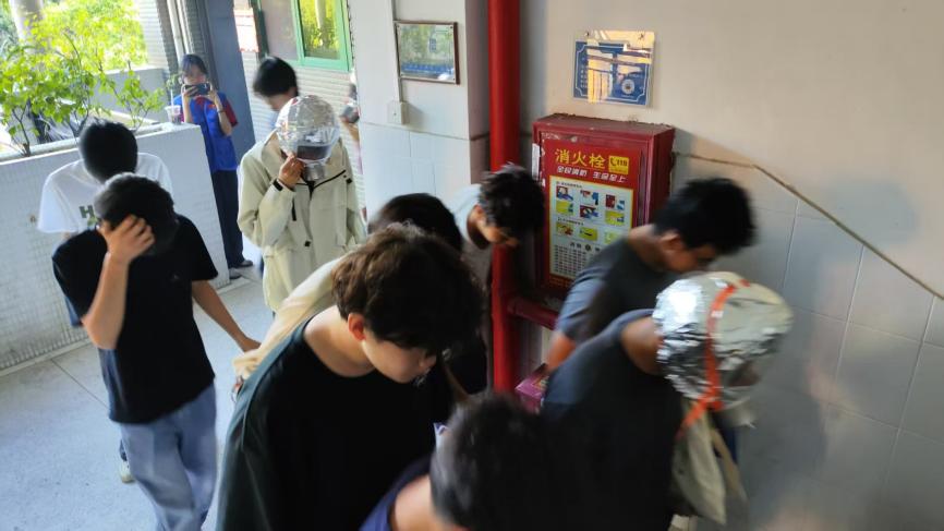 在防毒面罩實(shí)操結(jié)束后,進(jìn)行了人員疏散學(xué)習(xí)、緊急疏散學(xué)習(xí),以及疏散步驟學(xué)習(xí),并明確疏散技巧。隨時模擬濃煙升起,師生利用快速利用身旁工具減少毒煙吸入,不使用電梯,俯身沿墻體快速疏散到安全開闊的地方。