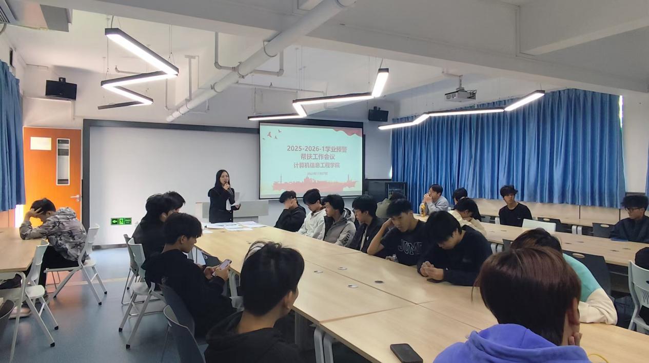 為精準(zhǔn)助力學(xué)業(yè)困難學(xué)生筑牢學(xué)業(yè)基礎(chǔ)、重拾學(xué)習(xí)信心,切實(shí)保障人才培養(yǎng)質(zhì)量,計(jì)算機(jī)信息工程學(xué)院于2025年11月27日召開2025-2026-1學(xué)期學(xué)業(yè)預(yù)警幫扶工作會(huì)議。會(huì)議由教務(wù)員黃斯華老師主持,全體學(xué)業(yè)預(yù)警學(xué)生參會(huì)。