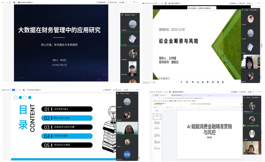 本次答辯經(jīng)過前期嚴(yán)格篩選,共有9位來自不同專業(yè)的優(yōu)秀畢業(yè)生代表參加。本次答辯采用線上線下結(jié)合方式。答辯過程中,同學(xué)們圍繞各自的論文選題,通過清晰的陳述、詳實(shí)的數(shù)據(jù)分析和完整的邏輯論證,展示了在校期間扎實(shí)的專業(yè)知識(shí)、熟練的技能應(yīng)用以及將理論聯(lián)系實(shí)際解決問題的能力。論文選題緊密契合“大數(shù)據(jù)+”時(shí)代背景,覆蓋智能財(cái)務(wù)分析、金融風(fēng)險(xiǎn)數(shù)據(jù)建模、數(shù)字化金融服務(wù)創(chuàng)新等多個(gè)前沿領(lǐng)域,體現(xiàn)了專業(yè)群緊跟行業(yè)發(fā)展趨勢(shì)、注重跨學(xué)科融合培養(yǎng)的特色。