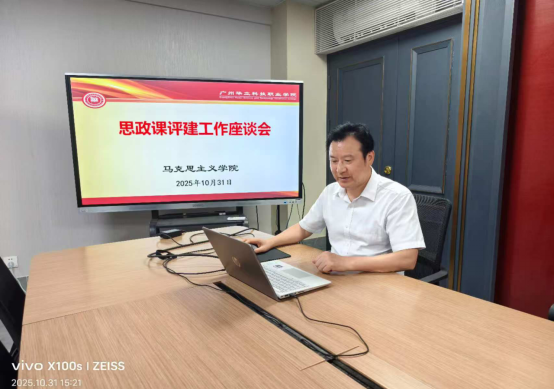 10月31日,為全面貫徹落實教育部辦公廳《關于開展2025-2026學年高校思政課課堂教學提升行動的通知》精神,堅持不懈用習近平新時代中國特色社會主義思想鑄魂育人,增強全體思政課教師的責任感和敬業(yè)精神,提高課堂教學質(zhì)量,馬克思主義學院在G1-314會議室召開思政課評建工作座談會。會議由廖良初院長主持。學校人事處處長鐘文浩、教務處副處長曾英姿、督導室主任王焰安、藝傳學院院長朱君以及全體思政課教師參加。