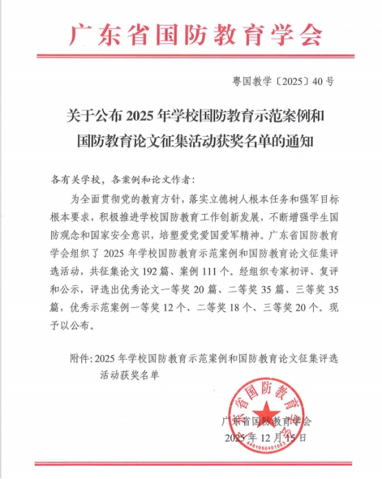 近日,我校思政課教師參加由廣東省國(guó)防教育學(xué)會(huì)組織的2025年學(xué)校國(guó)防教育示范案例和國(guó)防教育論文征集評(píng)選活動(dòng)并獲得榮譽(yù)。其中羅冰女、陳勝軍、黃冠霖等老師獲示范案例一等獎(jiǎng),何相寧老師獲優(yōu)秀論文二等獎(jiǎng)。