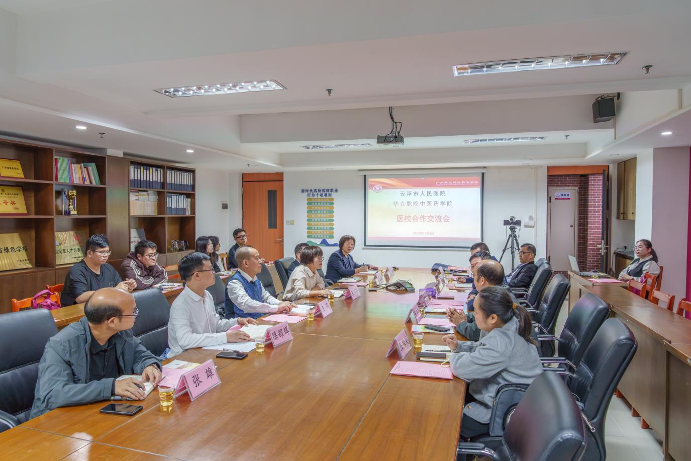 為進一步深化醫(yī)校合作,推動醫(yī)學教育與臨床實踐深度融合,培養(yǎng)更多符合行業(yè)需求的高素質(zhì)醫(yī)學人才,2025年11月4日下午云浮市人民醫(yī)院院長吳志華、副院長莫必華、醫(yī)務(wù)科副科長王振英、事業(yè)發(fā)展部主任陳 濤、醫(yī)務(wù)科袁興華等一行蒞臨我校,就醫(yī)校合作事宜開展專題交流。我校黨委副書記、副校長王洪艷熱情接待了來訪嘉賓,隨后醫(yī)校雙方在學校會議室開展合作交流座談會,出席本次交流的校方代表有中醫(yī)藥學院院長王暉、副院長張志勇和陳耀輝、教務(wù)處副處長李濤、招就處副主任張雄以及中醫(yī)藥學院相關(guān)老師。