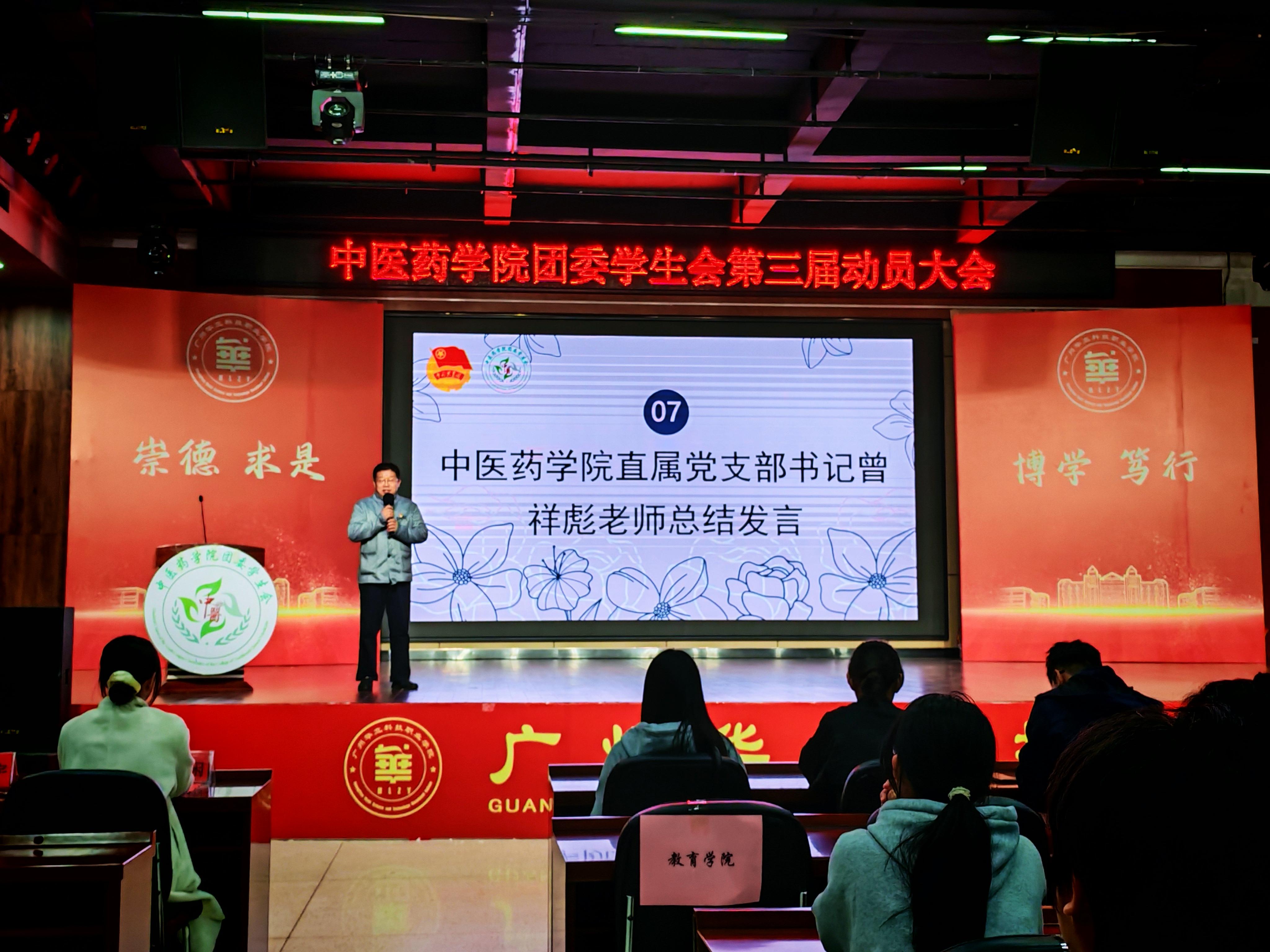 大會最后,中醫(yī)藥學院直屬黨支部書記曾祥彪老師對本次大會進行了全面而深刻地總結(jié)。充分肯定了本次大會的意義和成果,對新任干部表示祝賀,并對全體學生會成員提出了殷切希望和具體要求:要堅定理想信念,加強理論學習;要牢記服務(wù)宗旨,提升工作能力;要注重團結(jié)協(xié)作,促進交融;要勇于創(chuàng)新實踐,推動學生會工作再上新臺階。