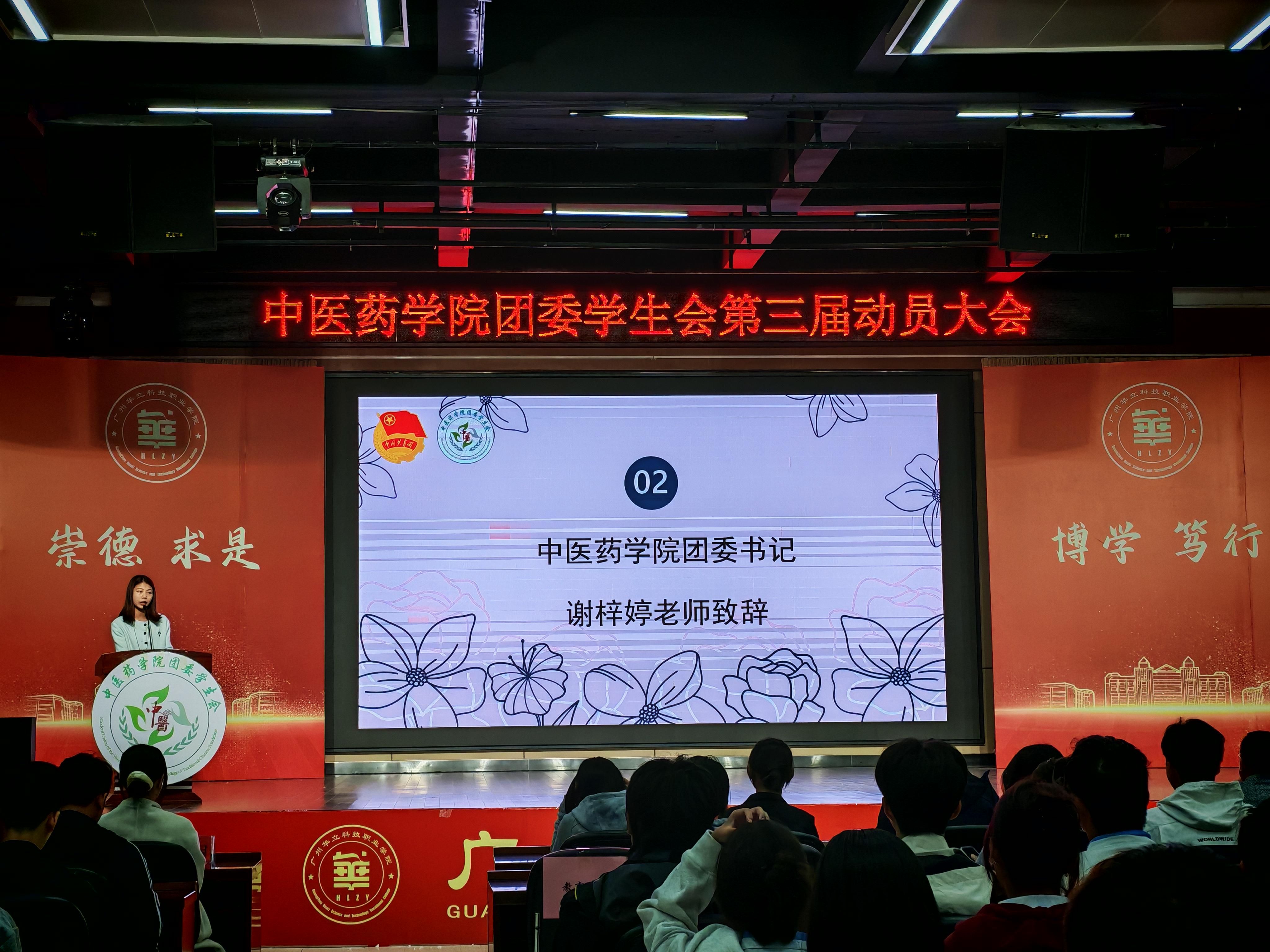 中醫(yī)藥學院團委書記謝梓婷老師上臺發(fā)言。謝梓婷老師首先對新生力量的加入表示熱烈歡迎,隨后結(jié)合學院特色與發(fā)展規(guī)劃,深入淺出地闡述了學生工作在個人成長與學院建設(shè)中的重要作用。她特別強調(diào)了學生組織在連接學院與學生之間的橋梁紐帶功能,并鼓勵新成員們積極適應(yīng)環(huán)境,勇于承擔責任,在服務(wù)同學的過程中鍛煉自我,提升綜合素質(zhì)。