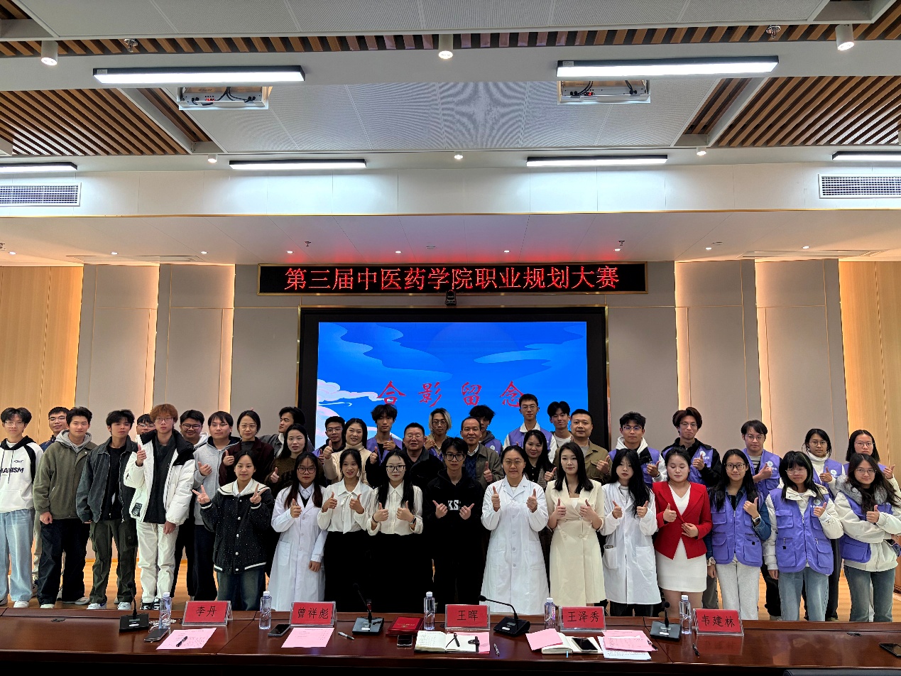 此次職業(yè)規(guī)劃大賽不僅為學(xué)子搭建了梳理職業(yè)思路、展現(xiàn)自我風(fēng)采的優(yōu)質(zhì)平臺,有效助力大家提升就業(yè)競爭力,更有力推動了學(xué)院職業(yè)規(guī)劃教育的深化發(fā)展,為培養(yǎng)兼具專業(yè)素養(yǎng)與職業(yè)規(guī)劃意識的中醫(yī)藥人才筑牢根基。最后,全體人員合影留念,為本次大賽畫上圓滿句號。
