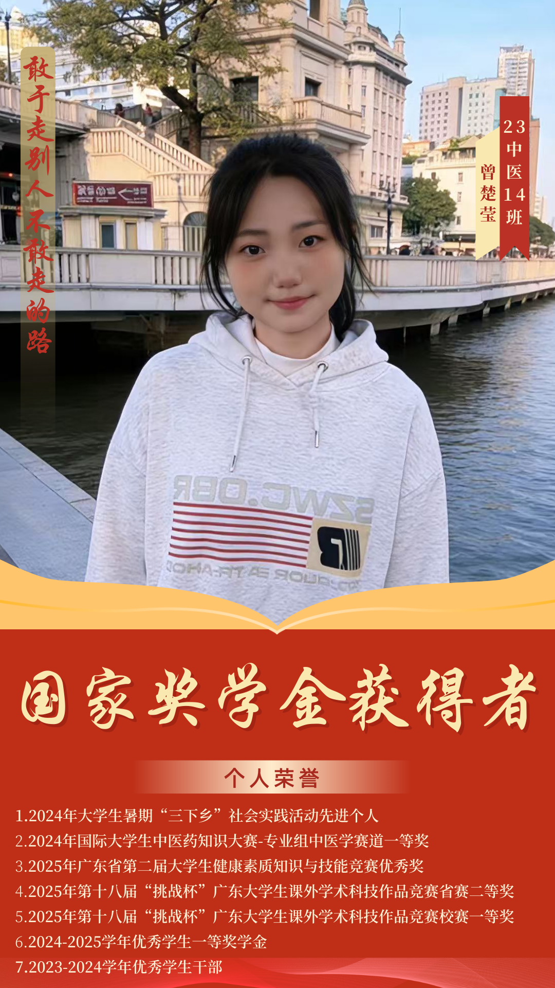 杏林綻芳華,巾幗競風(fēng)流。在2024-2025學(xué)年國家獎學(xué)金評選中,我院四名優(yōu)秀學(xué)子憑借扎實(shí)的專業(yè)素養(yǎng)、勤勉的治學(xué)態(tài)度和卓越的綜合表現(xiàn)脫穎而出,成功斬獲國家獎學(xué)金,用青春實(shí)績詮釋了中醫(yī)藥學(xué)子篤學(xué)求真、礪行致遠(yuǎn)的優(yōu)良風(fēng)貌。榜樣力量催人奮進(jìn),青春風(fēng)采薪火相傳。今天,讓我們一同走近這四位優(yōu)秀的巾幗學(xué)子,聆聽她們深耕杏林、逐夢前行的奮斗故事,汲取榜樣力量,感悟青春擔(dān)當(dāng),在傳承中醫(yī)藥薪火的道路上攜手奮進(jìn)、共譜華章。