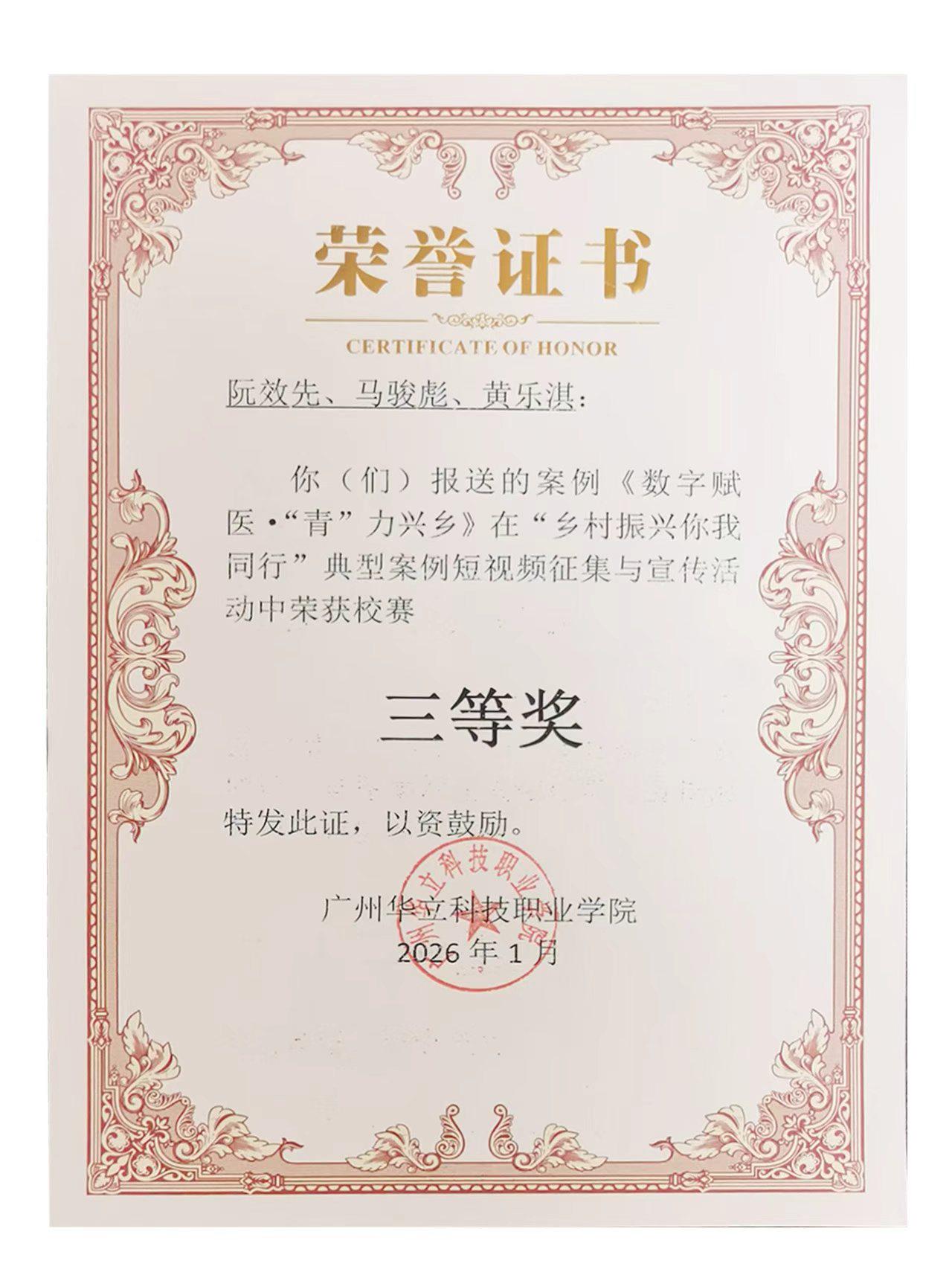 另一部獲獎(jiǎng)作品《數(shù)字賦醫(yī)?“青”力興鄉(xiāng)》由阮效先、馬駿彪、黃樂淇團(tuán)隊(duì)創(chuàng)作,憑借創(chuàng)新的表現(xiàn)形式與深刻的實(shí)踐內(nèi)涵斬獲三等獎(jiǎng)。作品突破傳統(tǒng)敘事模式,以數(shù)字視角切入,生動(dòng)呈現(xiàn)了中醫(yī)藥與大數(shù)據(jù)、新媒體技術(shù)深度融合的創(chuàng)新實(shí)踐。線上科普直播間里的干貨分享、云端問診平臺(tái)上的實(shí)時(shí)互動(dòng)、數(shù)字技術(shù)賦能下的藥材產(chǎn)銷對(duì)接…… 一個(gè)個(gè)鮮活場(chǎng)景,直觀展現(xiàn)了青年學(xué)子運(yùn)用現(xiàn)代科技為鄉(xiāng)村醫(yī)療注入新活力、為健康鄉(xiāng)村建設(shè)添磚加瓦的青春擔(dān)當(dāng),詮釋了“數(shù)字賦能 + 中醫(yī)藥”助力鄉(xiāng)村振興的全新路徑。